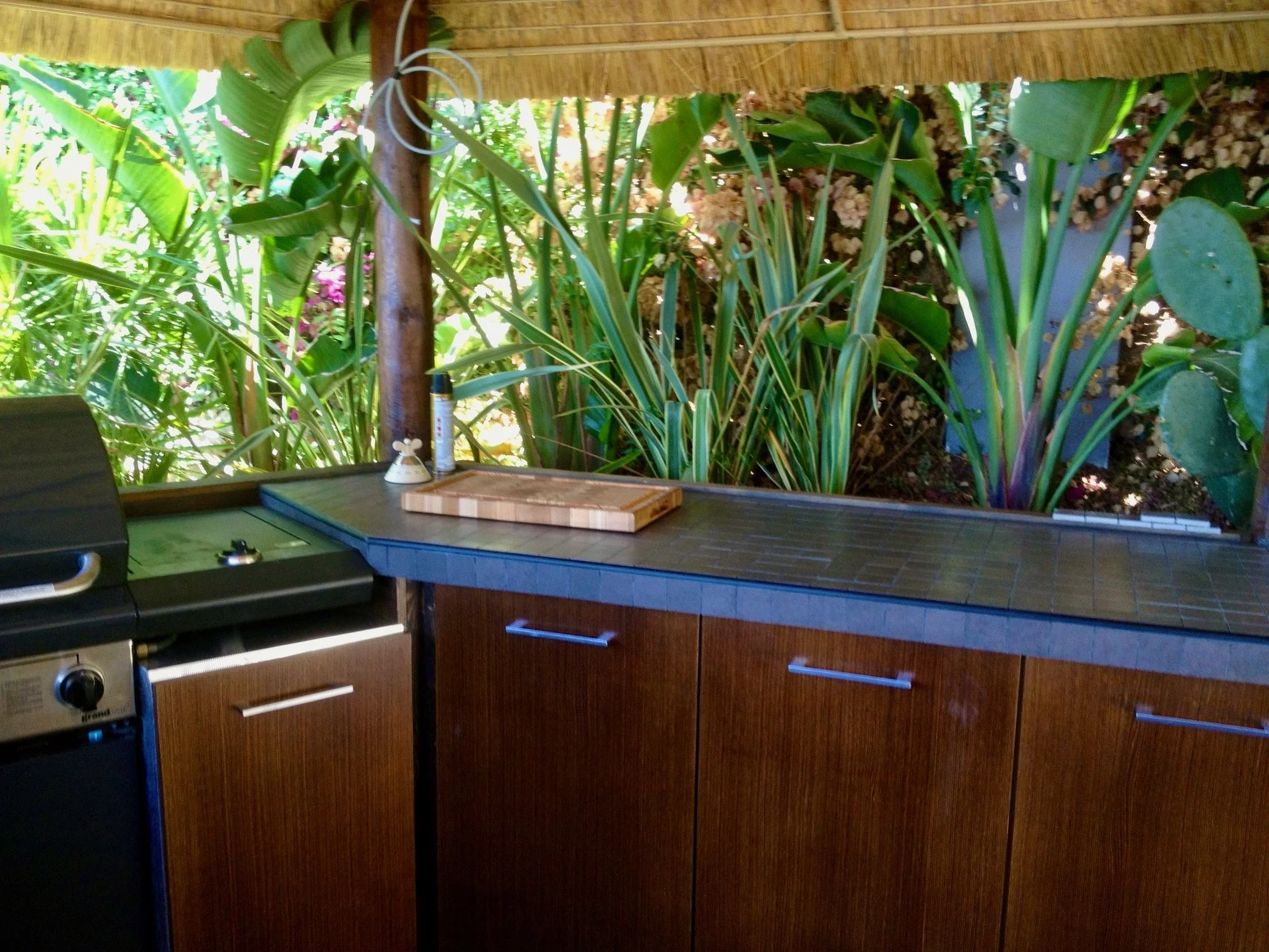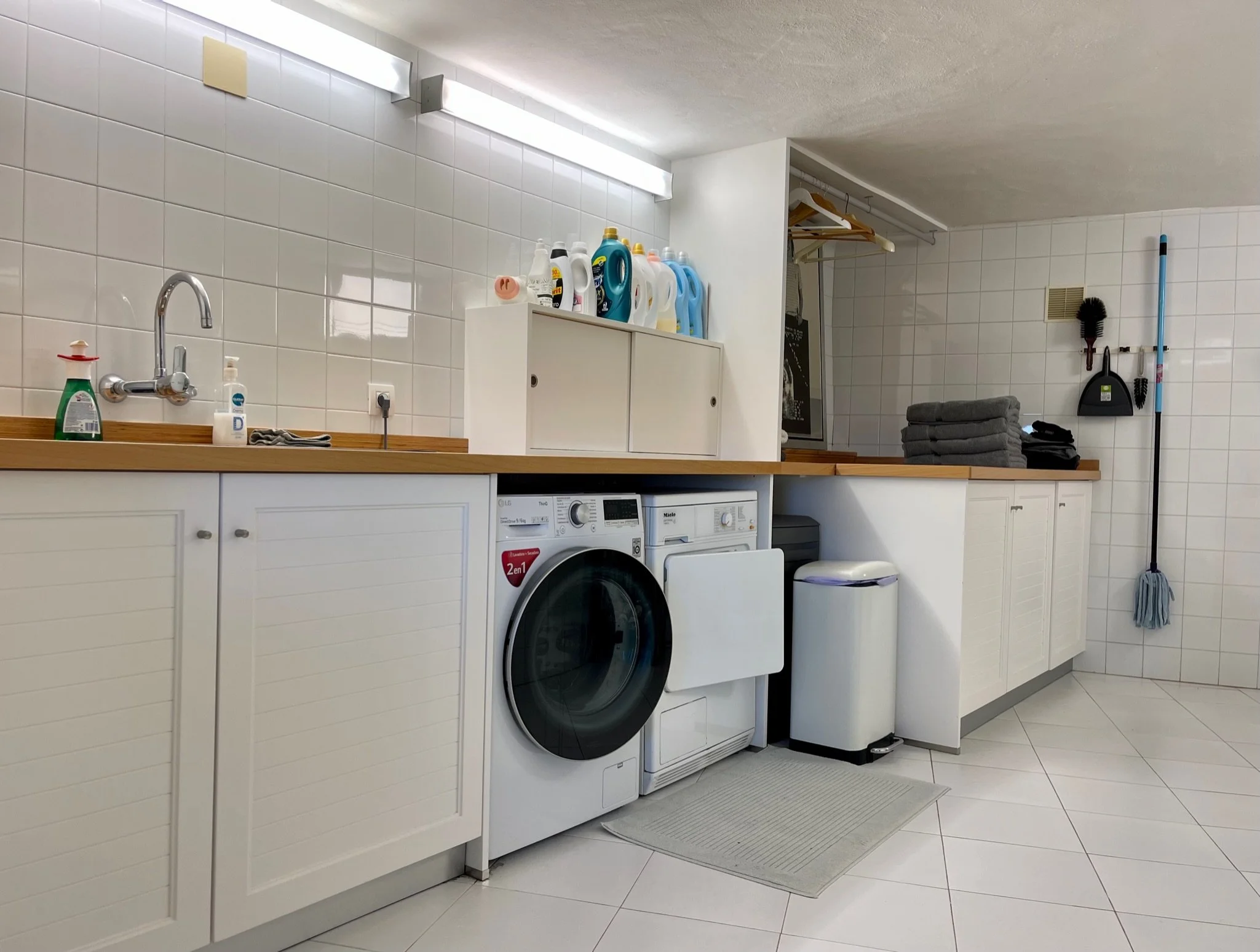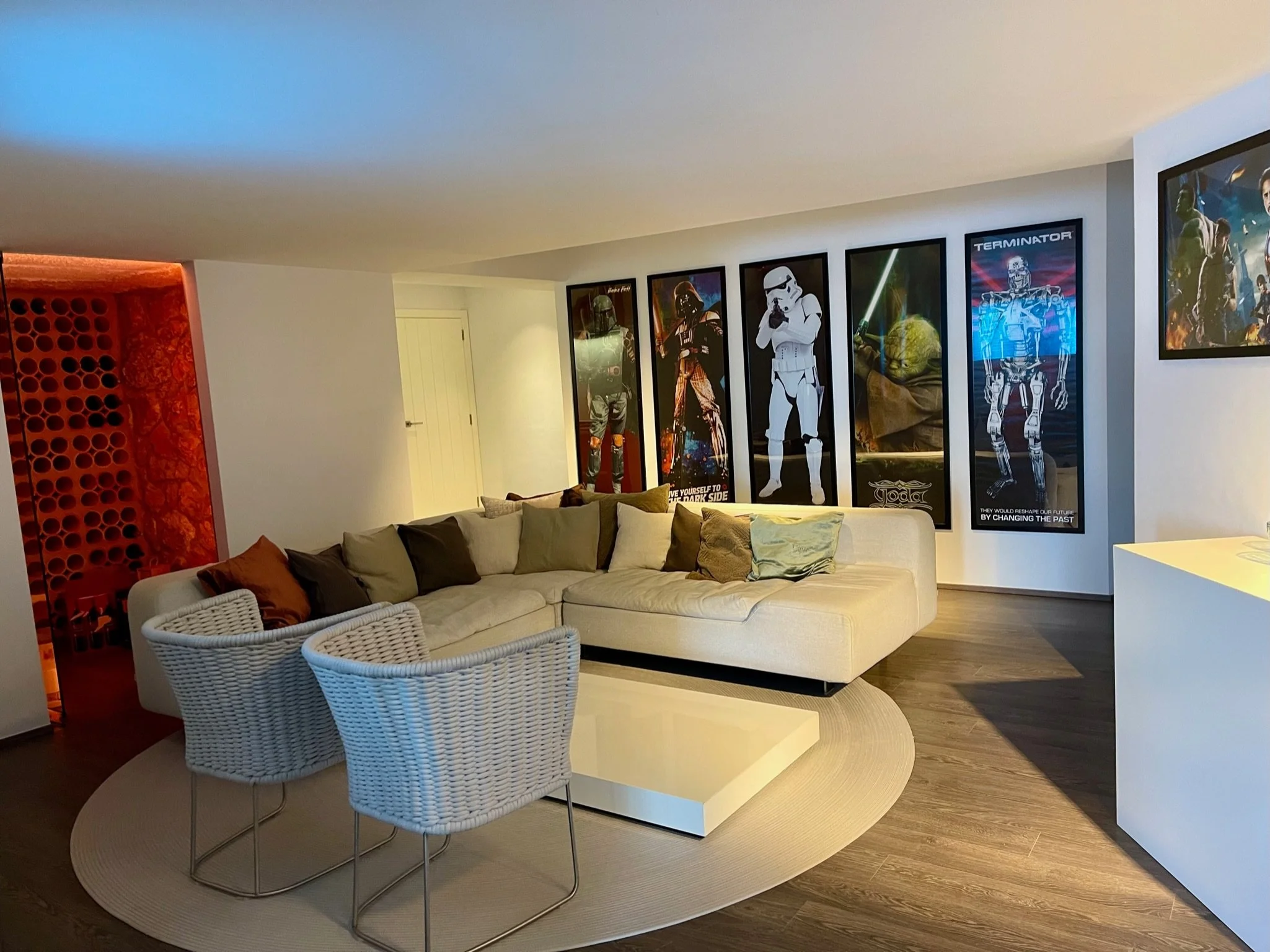 Lower level floor with another living area with kitchenette, 2 spacious open sea view bedrooms with ensuite dressing and bathroom, toilet, wine cellar, spacious storage room, gym, home cinema, office, laundry room and atelier. This floor also has his own terrace with tropical kitchen hut and dining area.